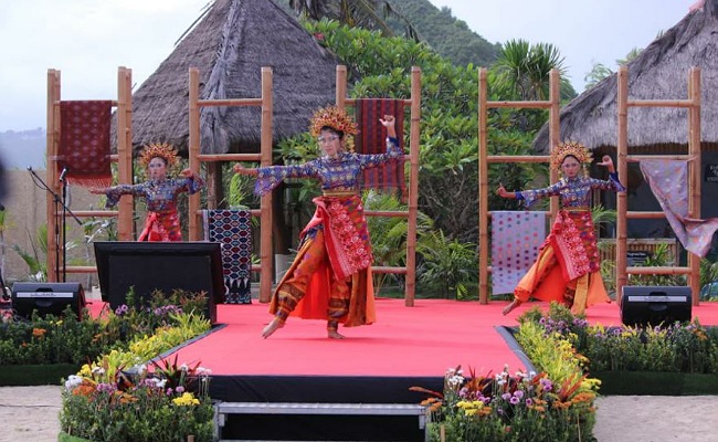 | Pegelaran seni tari dalam Festival Bau Nyale 2021 dan Gernas BBI Bulan Belanja Buatan NTB, di Hotel Novotel, Kuta Mandalika, Lombok Tengah. |